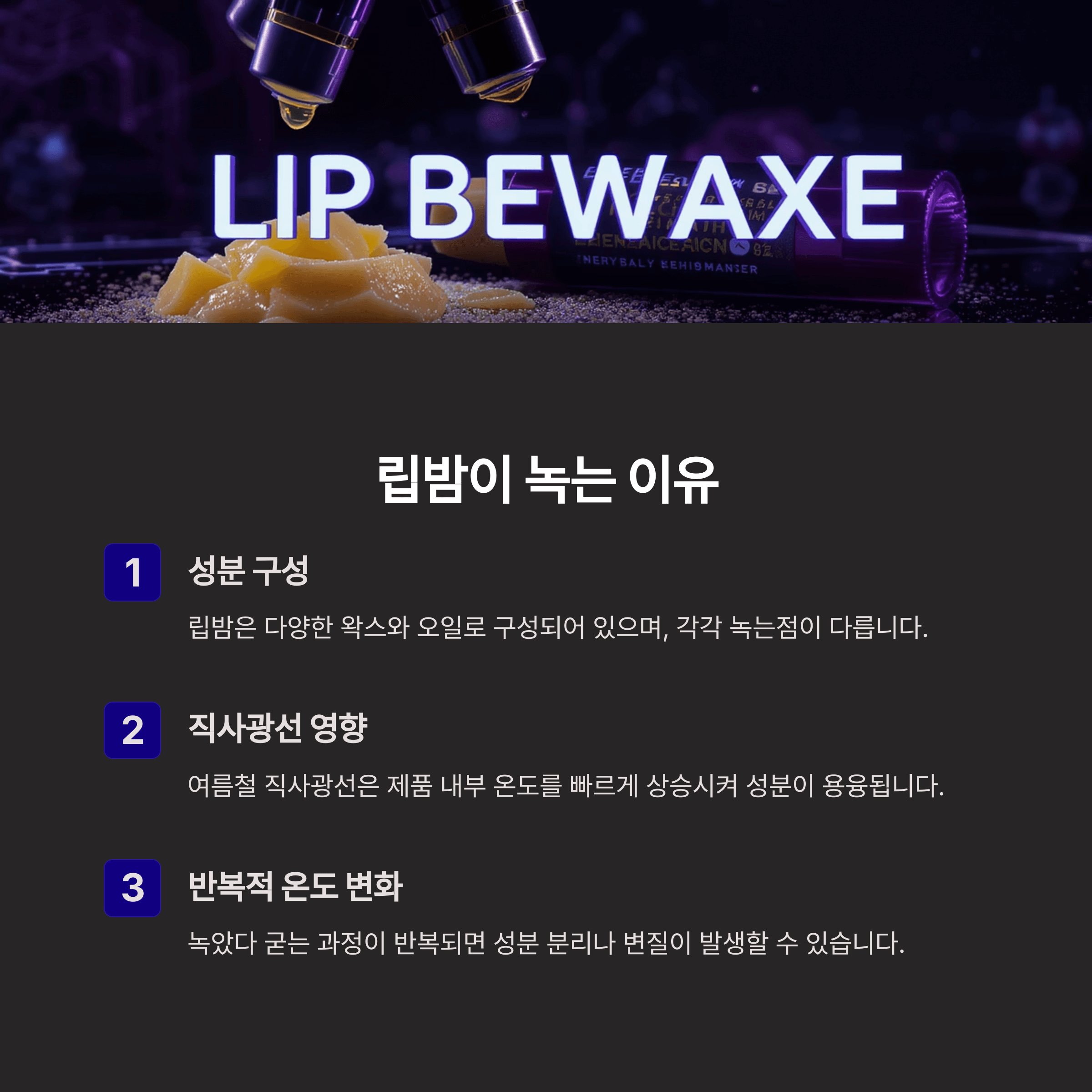 | 천연 립밤 | 비즈왁스, 시어버터 | 62℃ / 34~38℃ | 서늘한 서랍, 짧은 냉장 보관 |