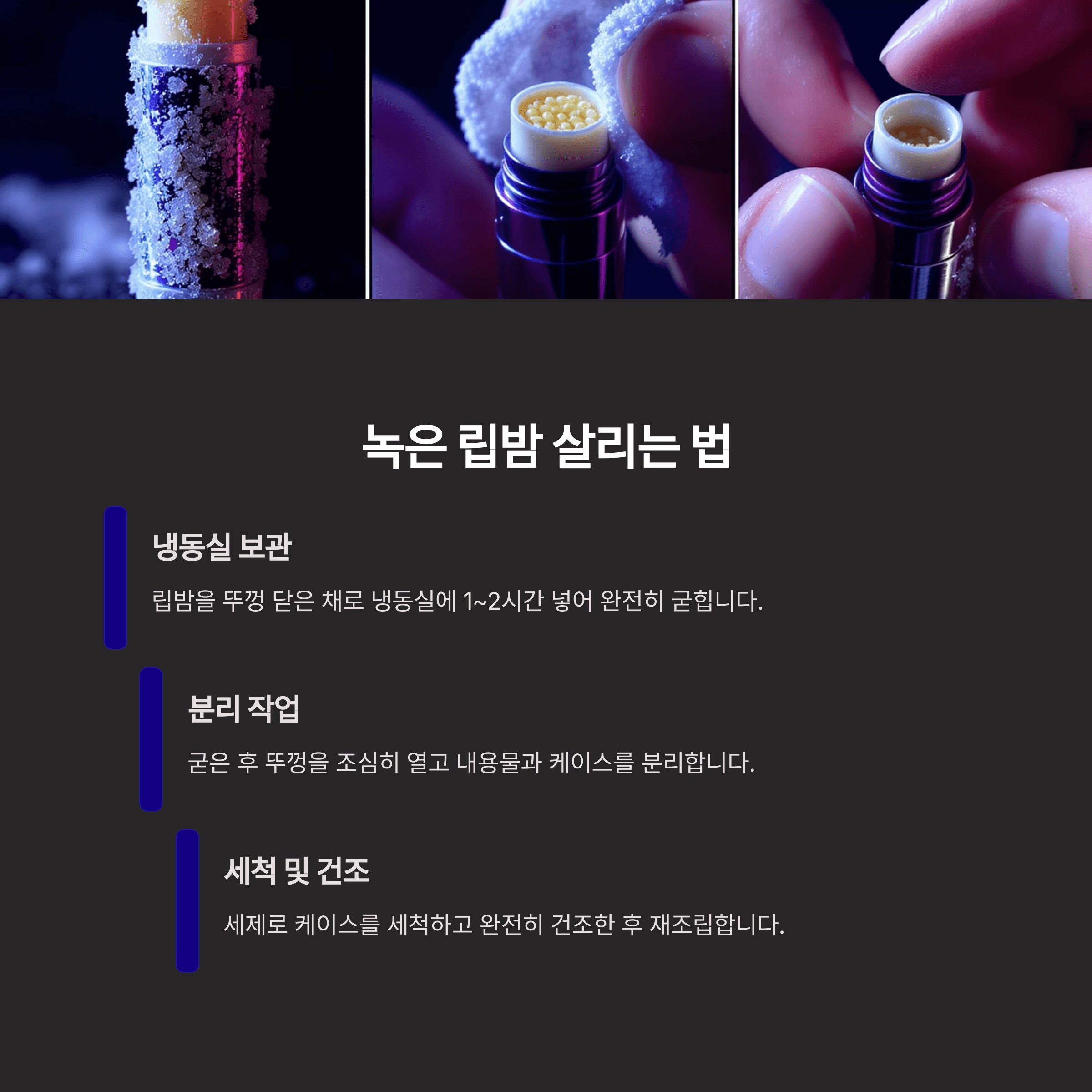 아차! 립밤이 녹아버렸다면 너무 낙담하지 마세요. 간단한 처치만으로도 제품을 다시 깔끔하게 사용할 수 있어요.