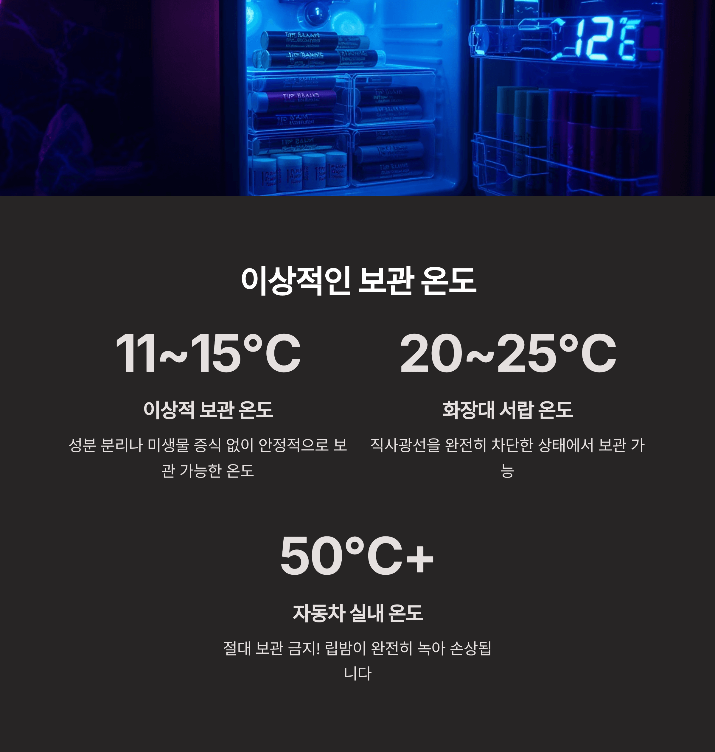 | 화장품 냉장고 | 11~15℃ | 짧게 보관하고 자주 꺼내지 않기 |