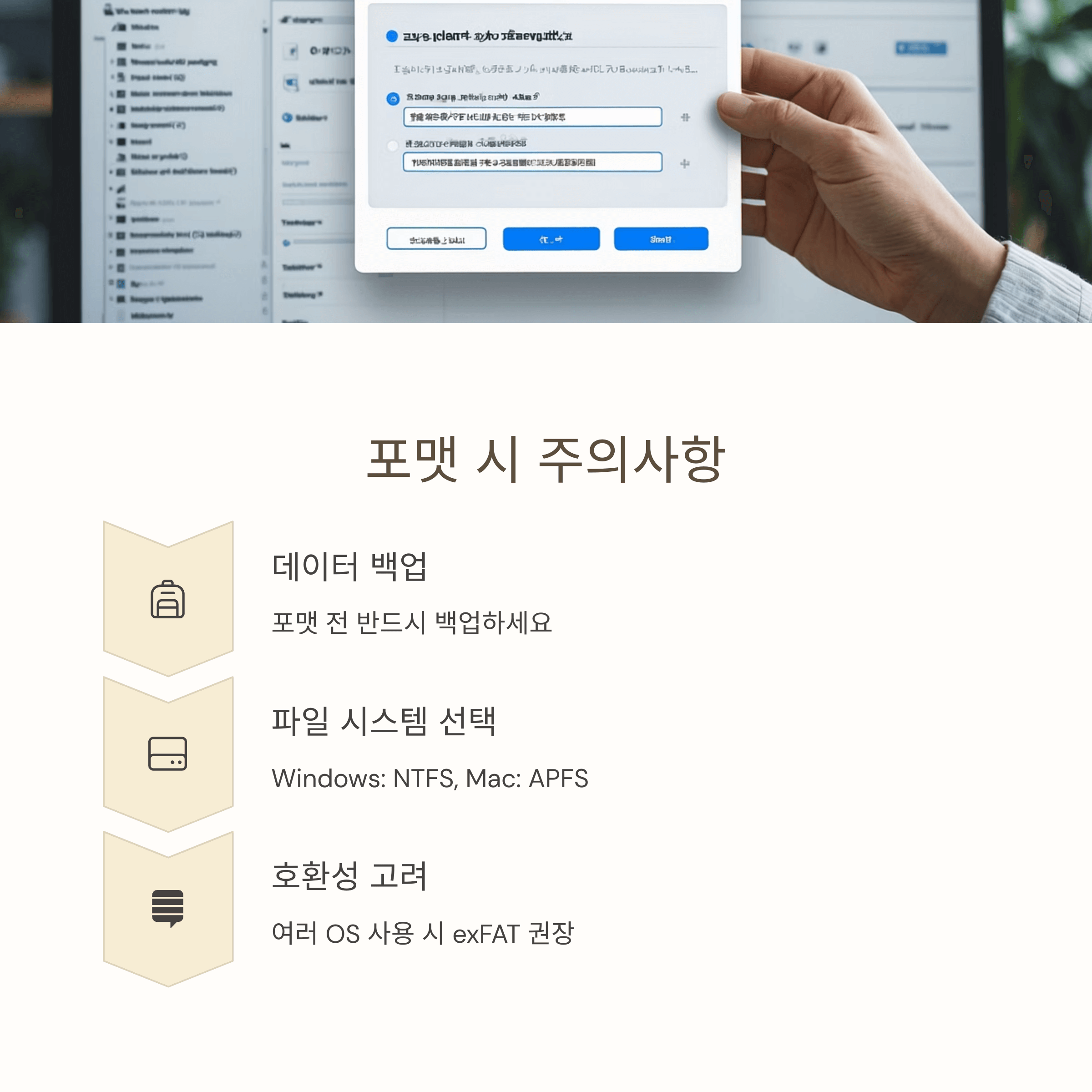 정말 어쩔 수 없을 때 외장하드를 포맷하는 경우가 있어요. 하지만 중요한 데이터를 잃지 않으려면 반드시 사전 확인이 필요하죠. 다른 컴퓨터에서 인식이 되는지 확인하고, 복구 툴로 데이터를 최대한 백업해 놓은 후에 진행하세요. 포맷할 땐 사용하는 운영체제에 따라 파일 시스템을 적절히 선택하는 것도 중요하답니다.